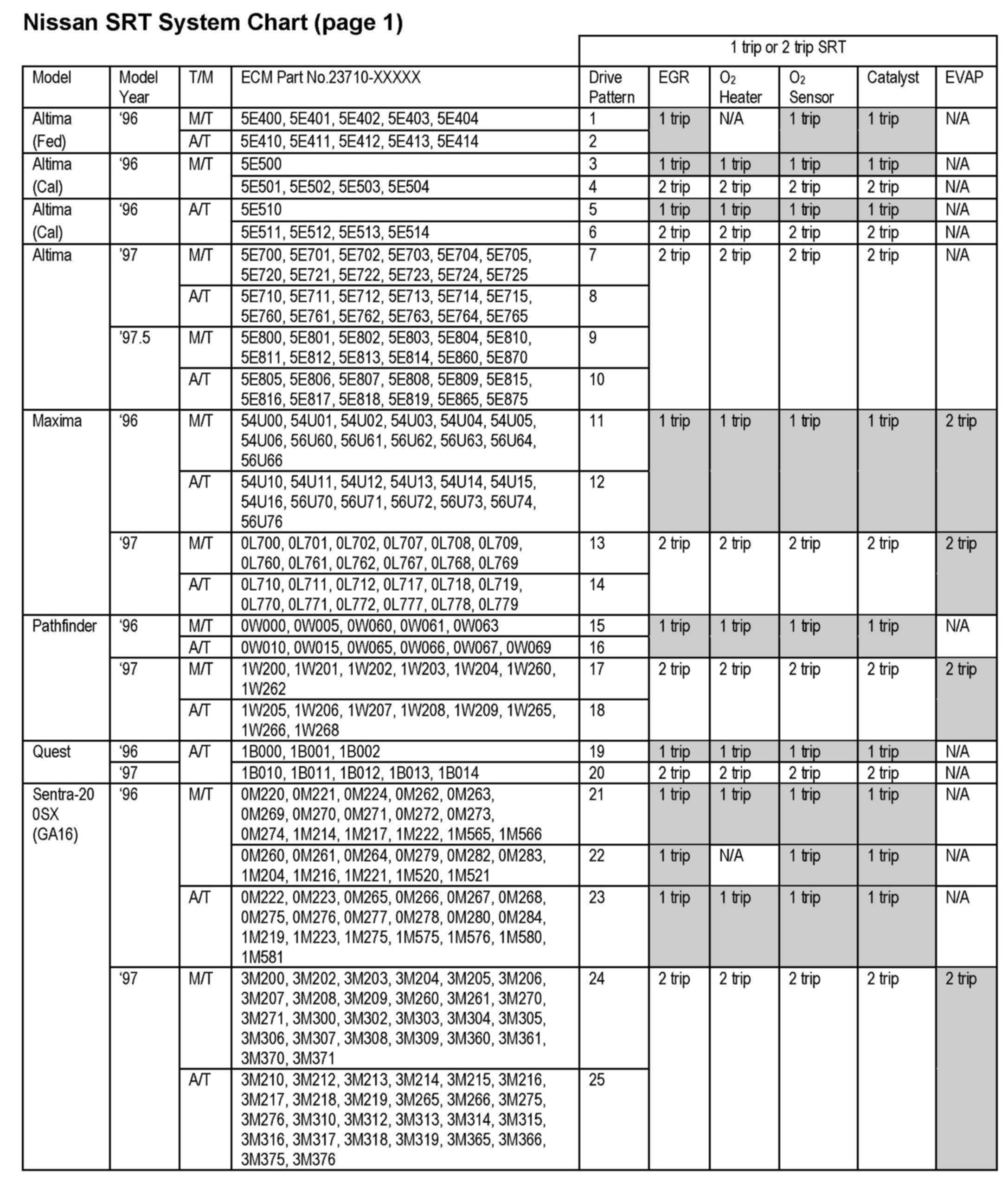 3. Compare the vehicles ECM part number with the list of ECM part numbers provided in the Nissan SRT System Chart above to determine the Drive Pattern for the vehicle being inspected.