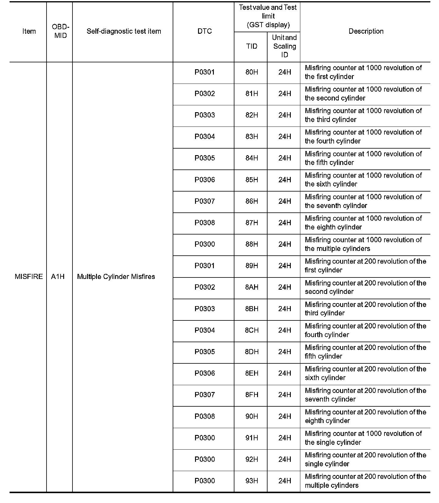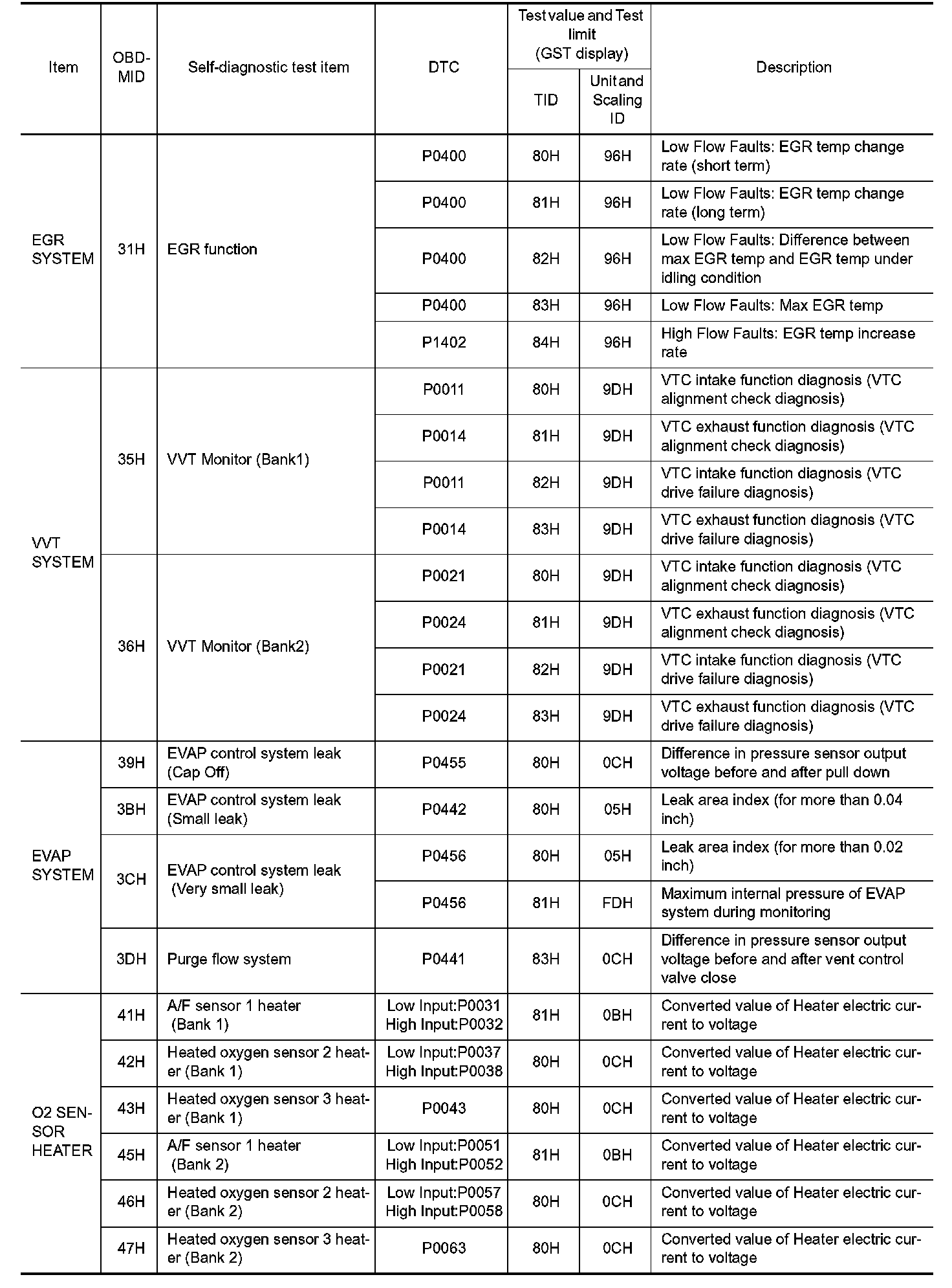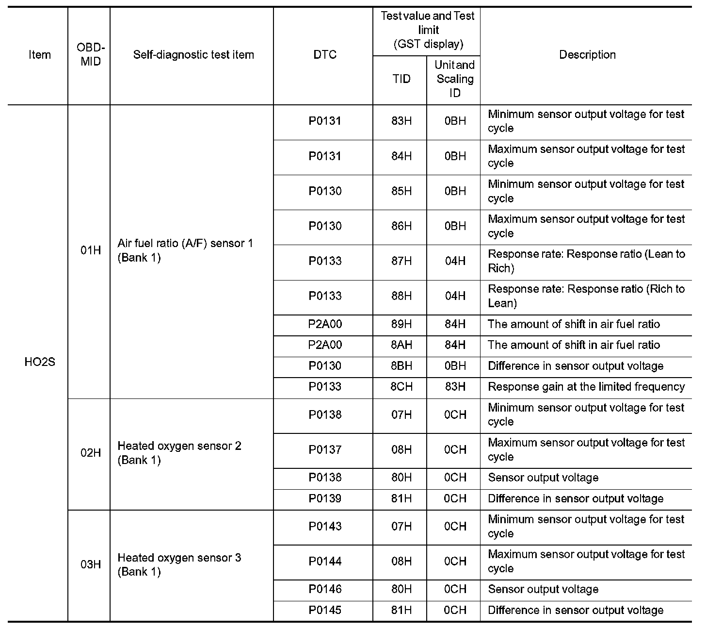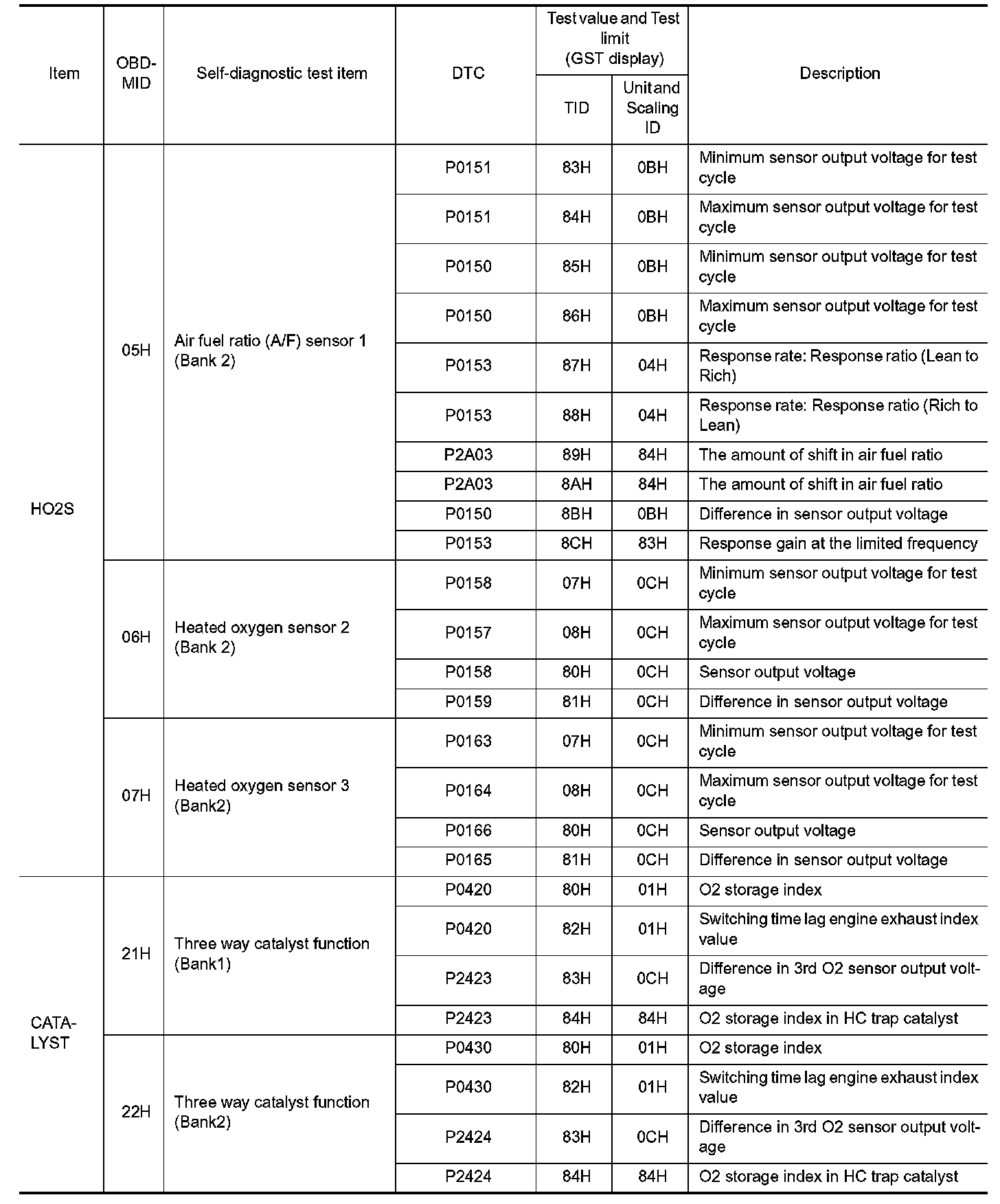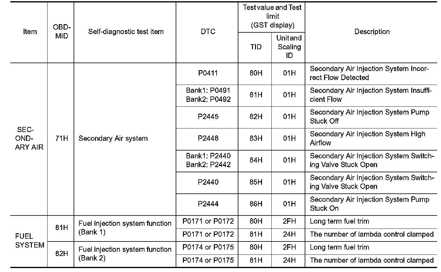 These data (test value and test limit) are specified by On Board Monitor ID(OBDMID), Test ID (TID), Unit and Scaling ID and can be displayed on the GST screen.