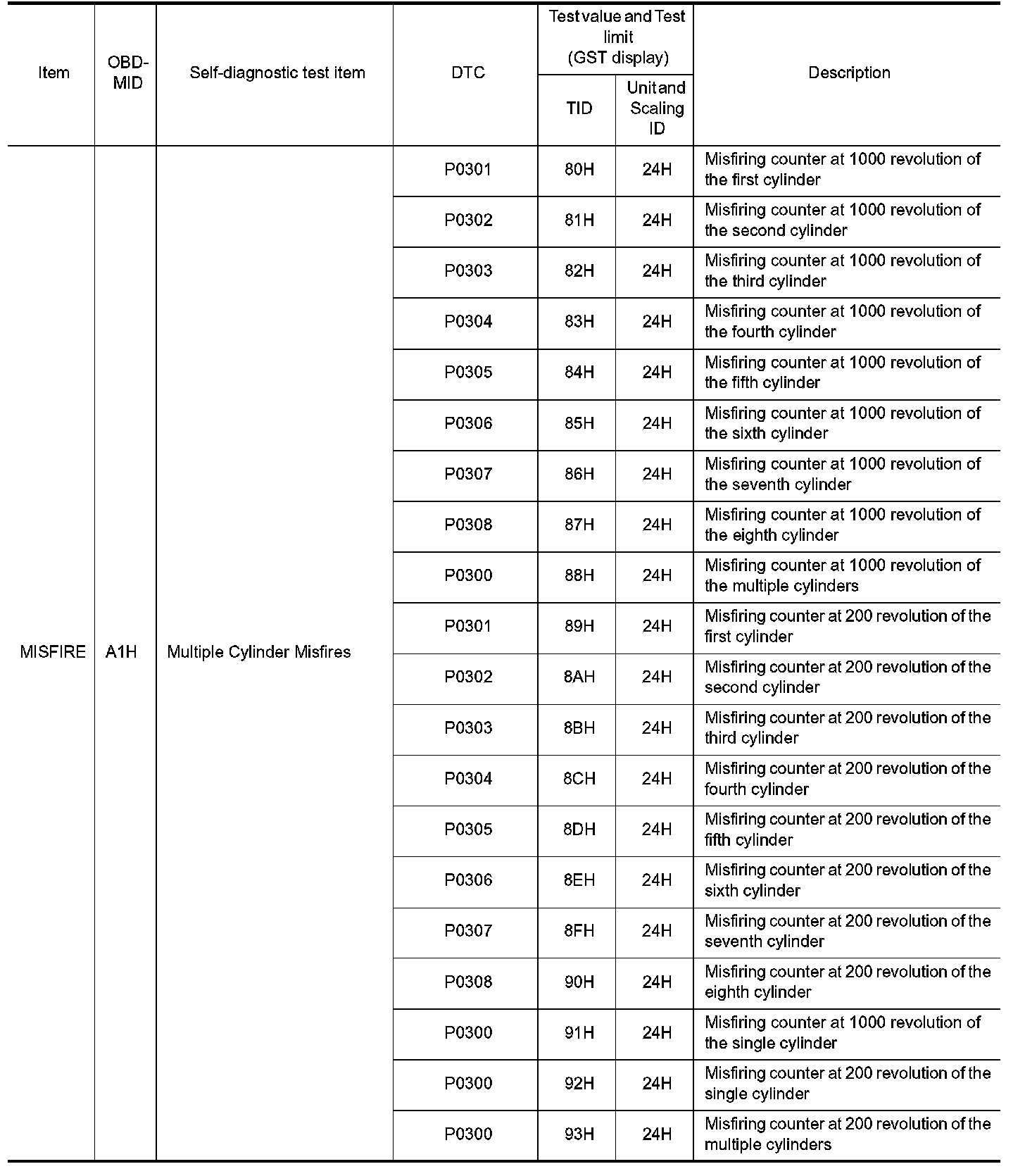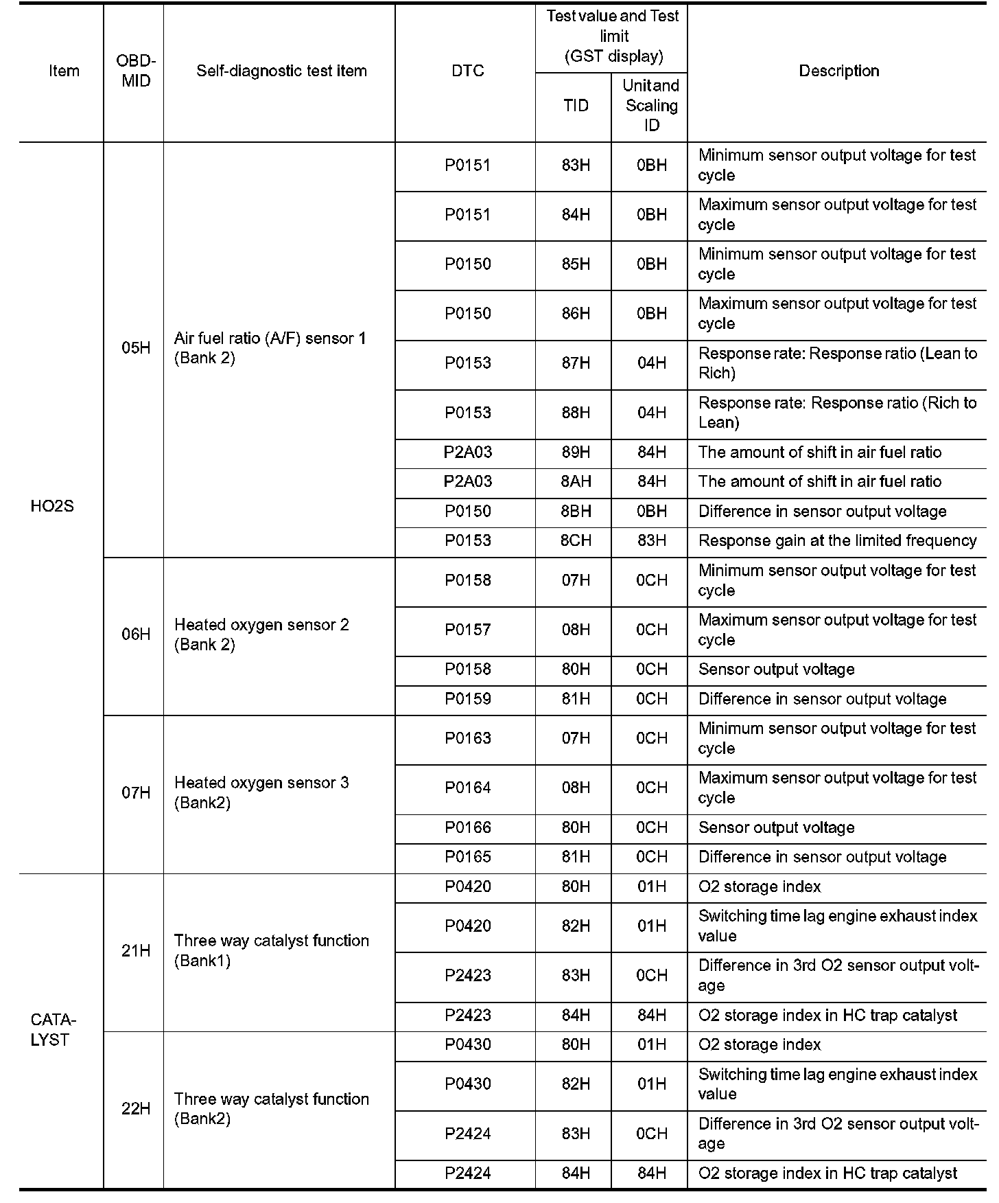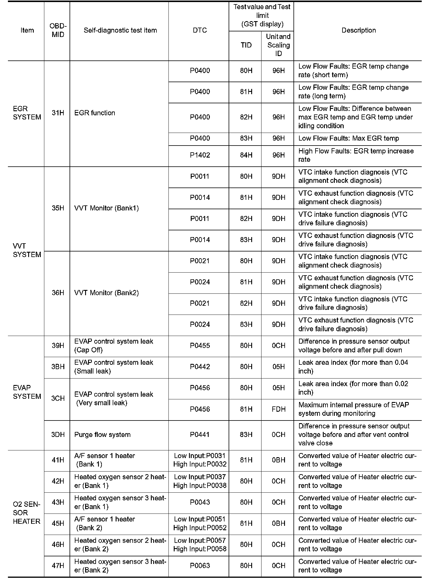 These data (test value and test limit) are specified by On Board Monitor ID(OBDMID), Test ID (TID), Unit and Scaling ID and can be displayed on the GST screen.