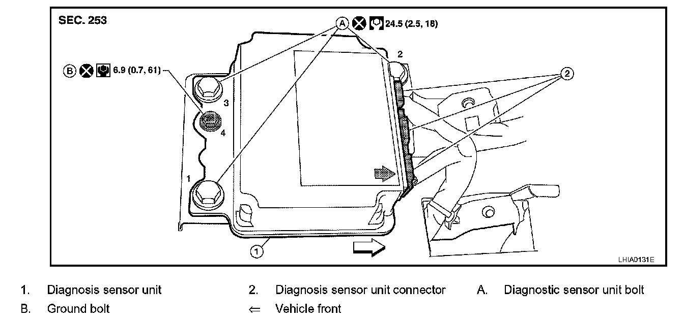 - The diagnosis sensor unit must always be installed with the arrow mark "<-" pointing toward the front of the vehicle.