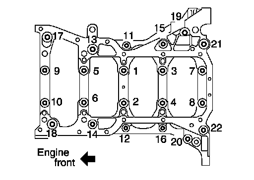 1. Tighten lower cylinder block bolts in the numerical order as shown and according to the following steps: