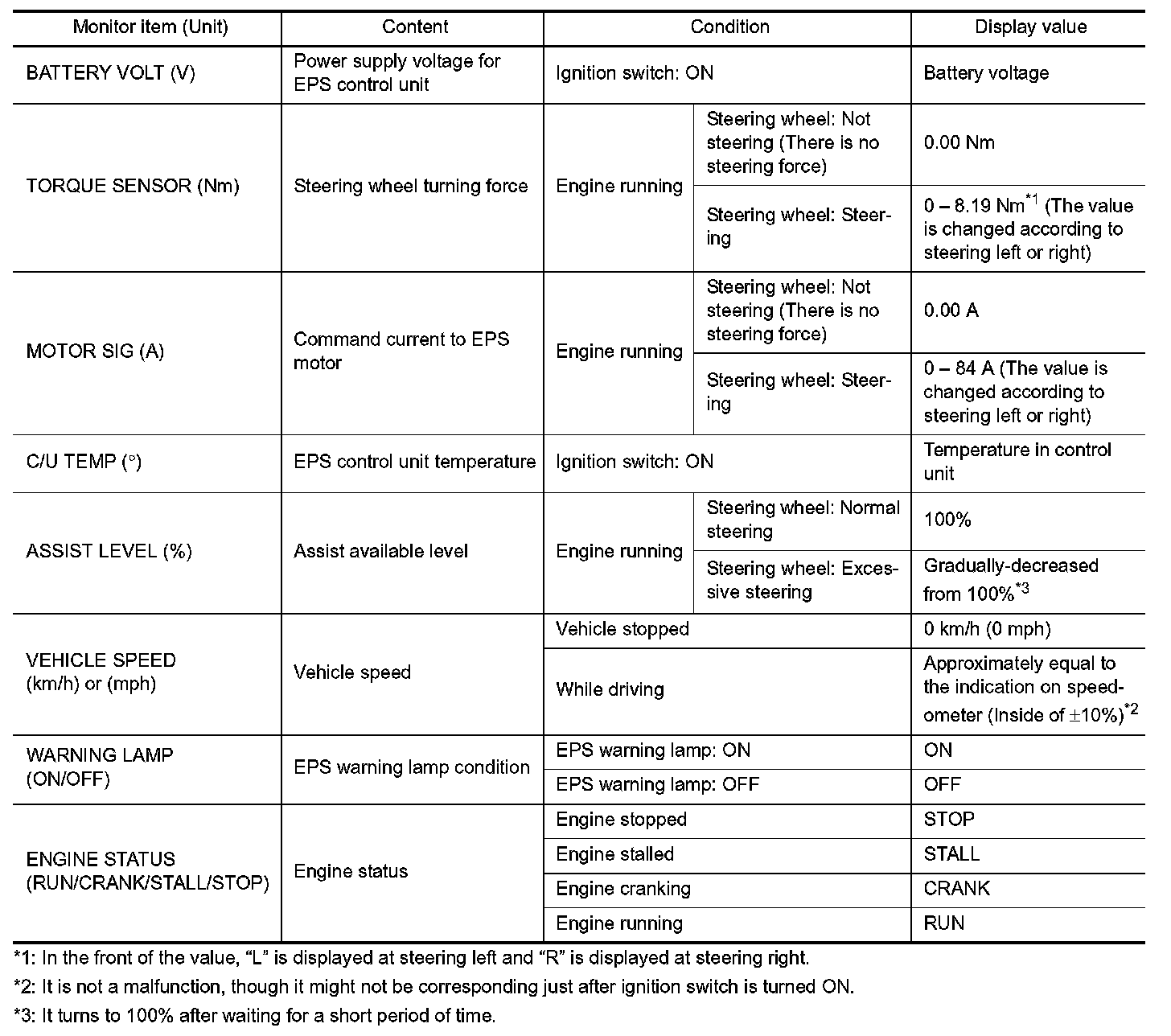 EPS Control Unit Input/Output Signal Reference Value
