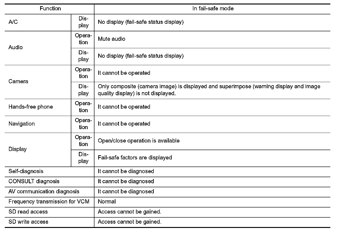 When the system is in the fail-safe status at or after start of the AV control unit, the following functions are restricted.
