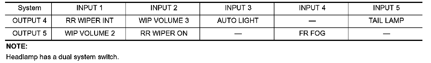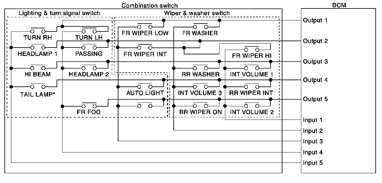 - BCM detects the combination switch status signal "5AD" when the signals of OUTPUT 1 and OUTPUT 4 are input to INPUT 5.