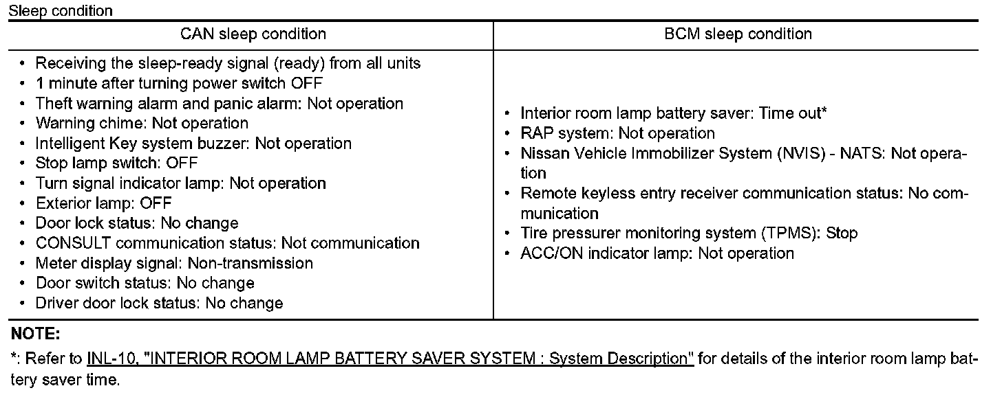 - BCM transmits the sleep wake up signal (sleep) to each unit when all of the CAN sleep conditions are fulfilled.