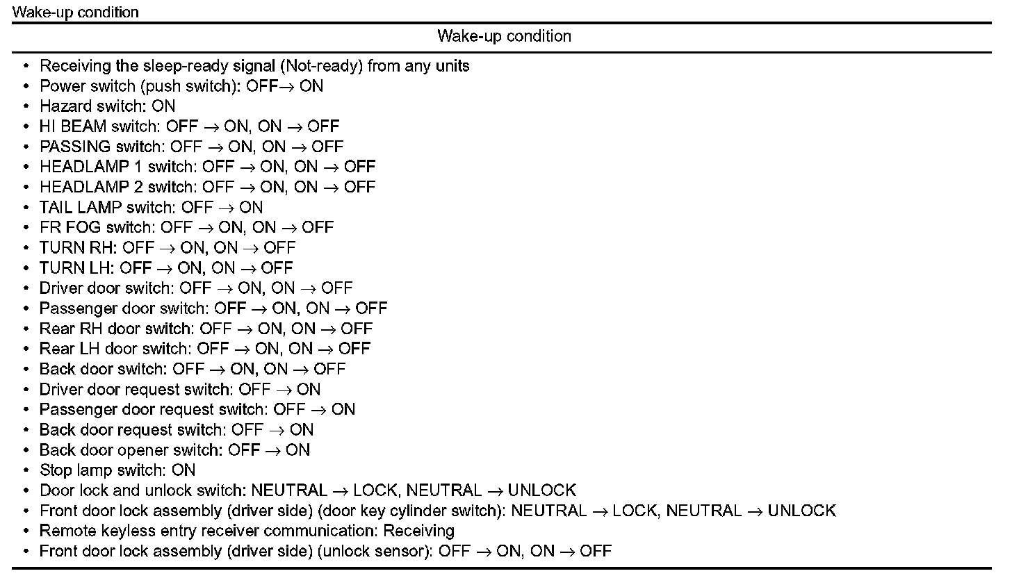 - BCM transmits sleep wake up signal (wake up) to each unit when any condition listed below is established, and then goes into normal mode from low power consumption mode.
