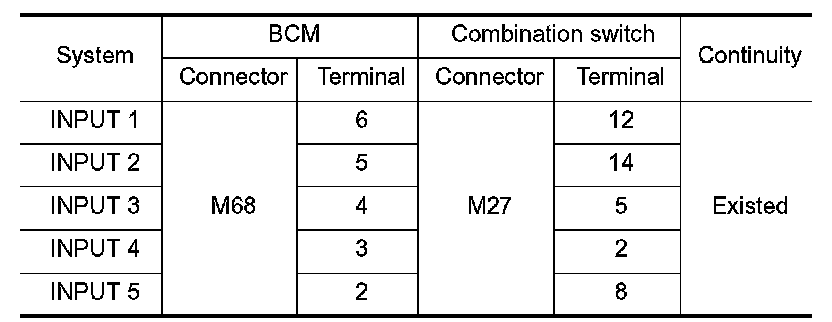 3.Check continuity between BCM harness connector and combination switch harness connector.