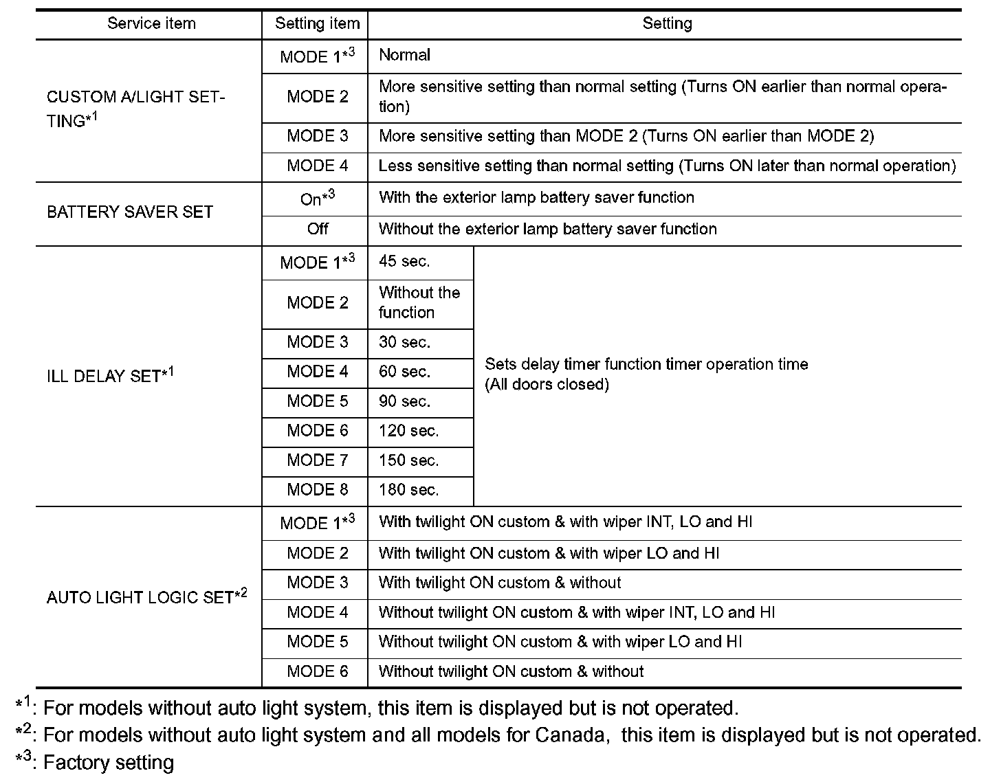 *: For models without auto light system and all models for Canada, this item is displayed but is not operated.