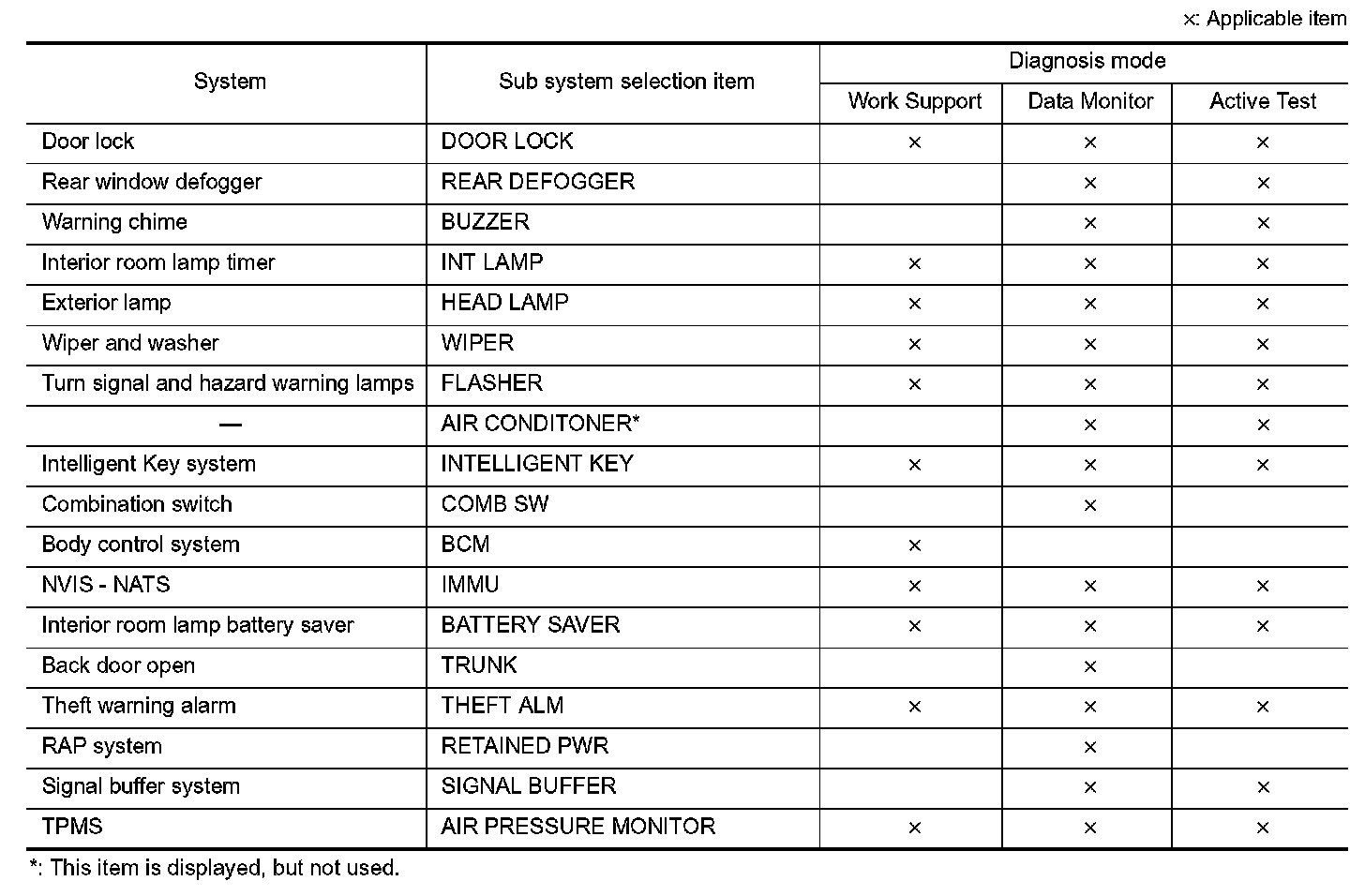 It can perform the diagnosis modes except the following for all sub system selection items.