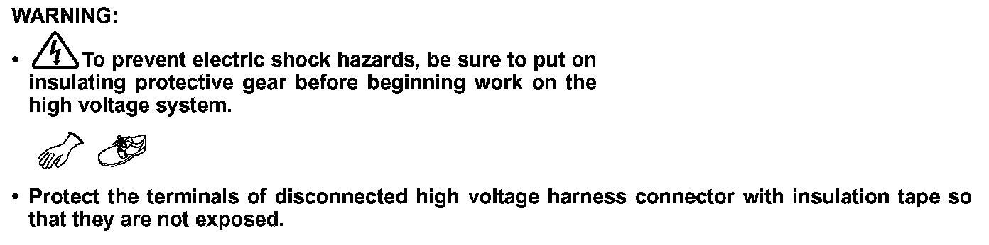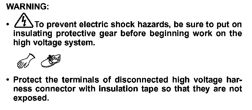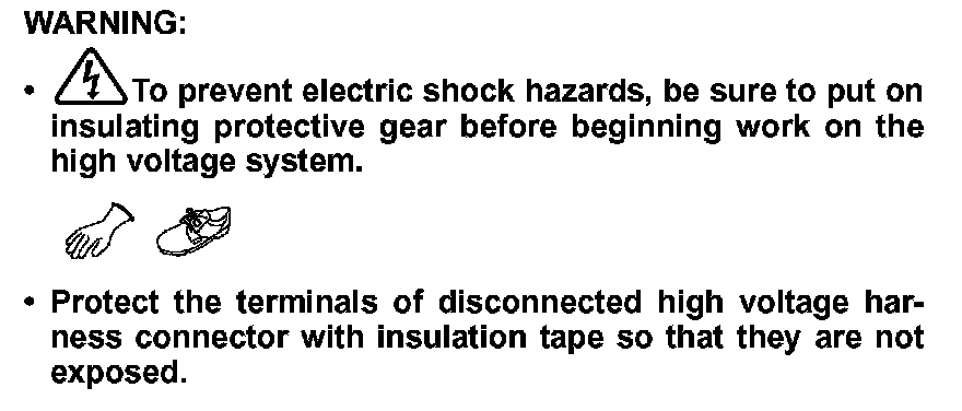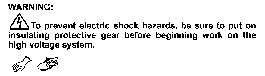 -To prevent electric shock hazards, be sure to put on insulating protective gear before beginning work on the high voltage system.
