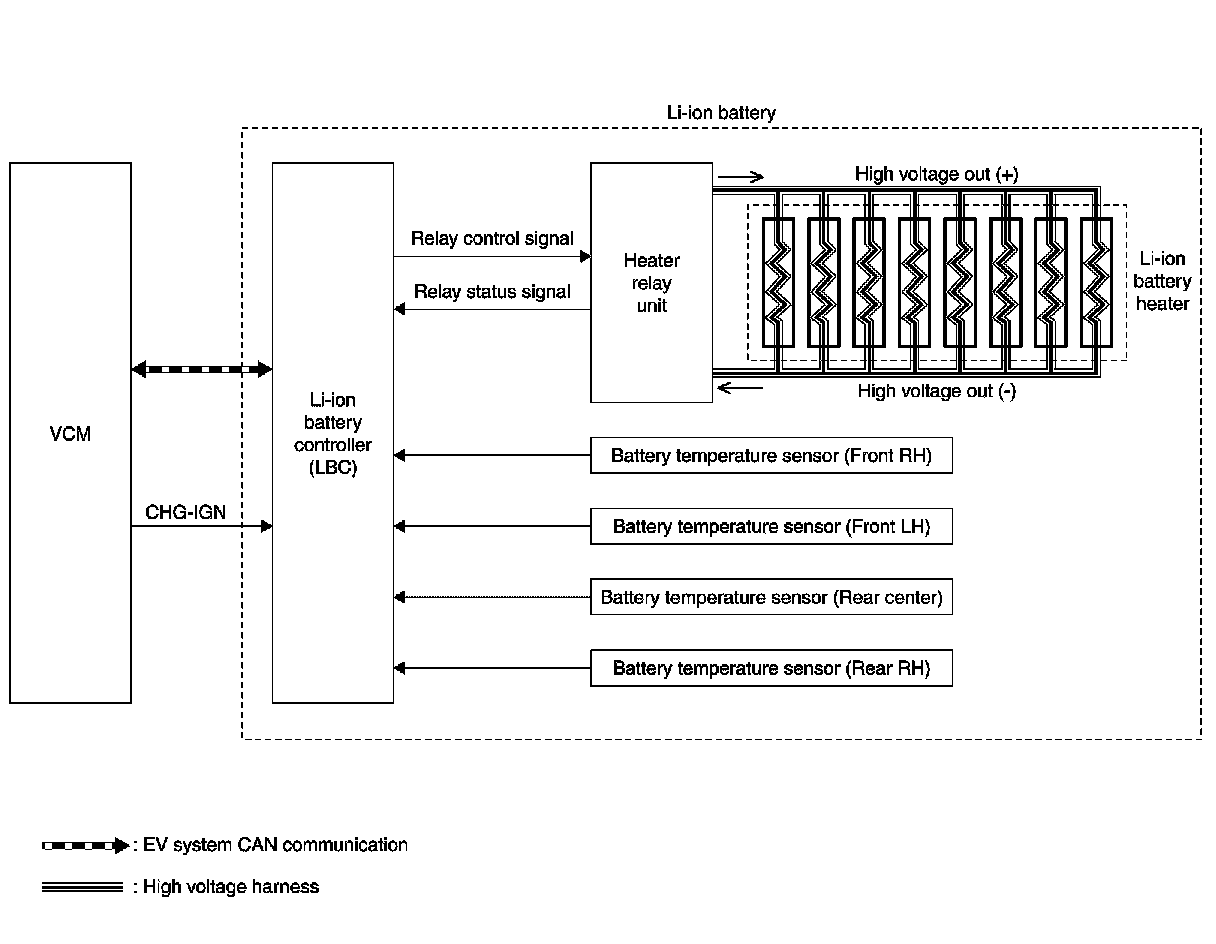 - The Li-ion battery controller (LBC) detects a temperature in the battery pack, according to a signal transmitted from the battery temperature sensor installed to the battery pack and judges the activation of the Li-ion battery heater.