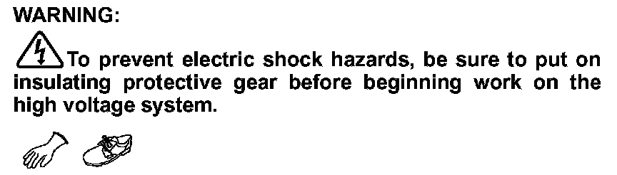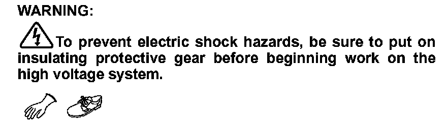 - Be sure to wear insulating protective equipment consisting of glove, shoes, face shield and glasses before beginning work on the high voltage system.