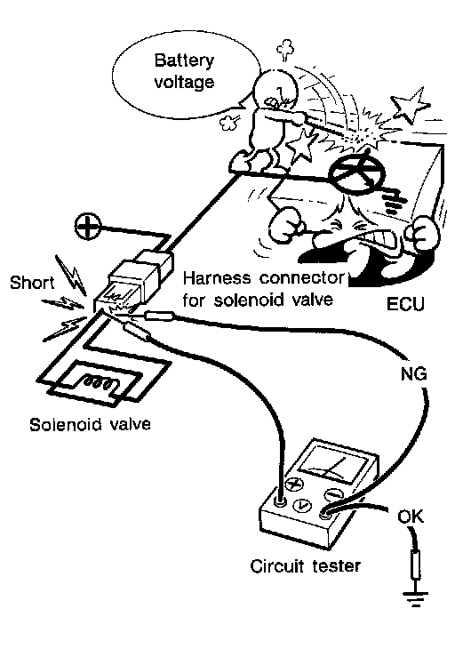 Accidental contact of probes will cause a short circuit and damage the ECU power transistor.