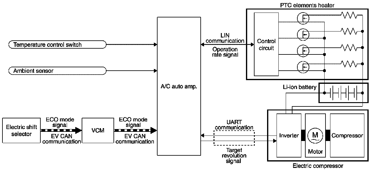 - When ECO mode is selected with the electric shift selector, VCM transmits the ECO mode request signal to the A/C auto amp.