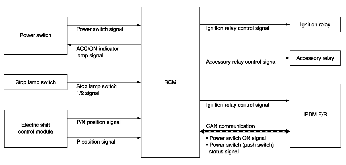 - Power switch (push switch) operation is input to BCM as a signal. BCM changes the power switch position according to the status and operates the following relays to supply power to each power circuit.