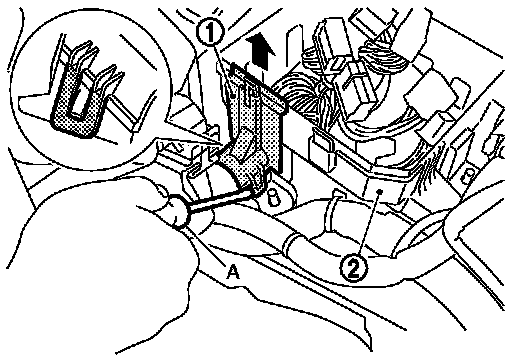 2.Press and expand pawls (A) on lateral side of IPDM E/R cover and remove IPDM E/R (1) from IPDM E/R cover B (2).