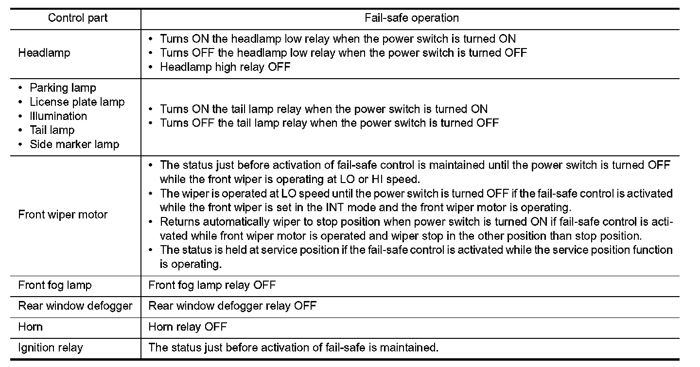 - If the ignition relay cannot turn OFF due to contact seizure, it activates the tail lamp relay for 10 minutes to alert the user to the ignition relay malfunction when the power switch is turned OFF.