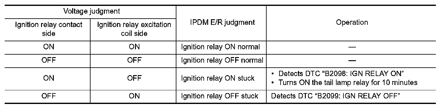 - IPDM E/R judges the ignition relay error if the voltage differs between the contact circuit and the excitation coil circuit.