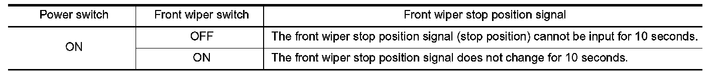 When a front wiper stop position signal is in the conditions listed below, IPDM E/R stops power supply to wiper after repeating a front wiper 10 seconds activation and 20 seconds stop.