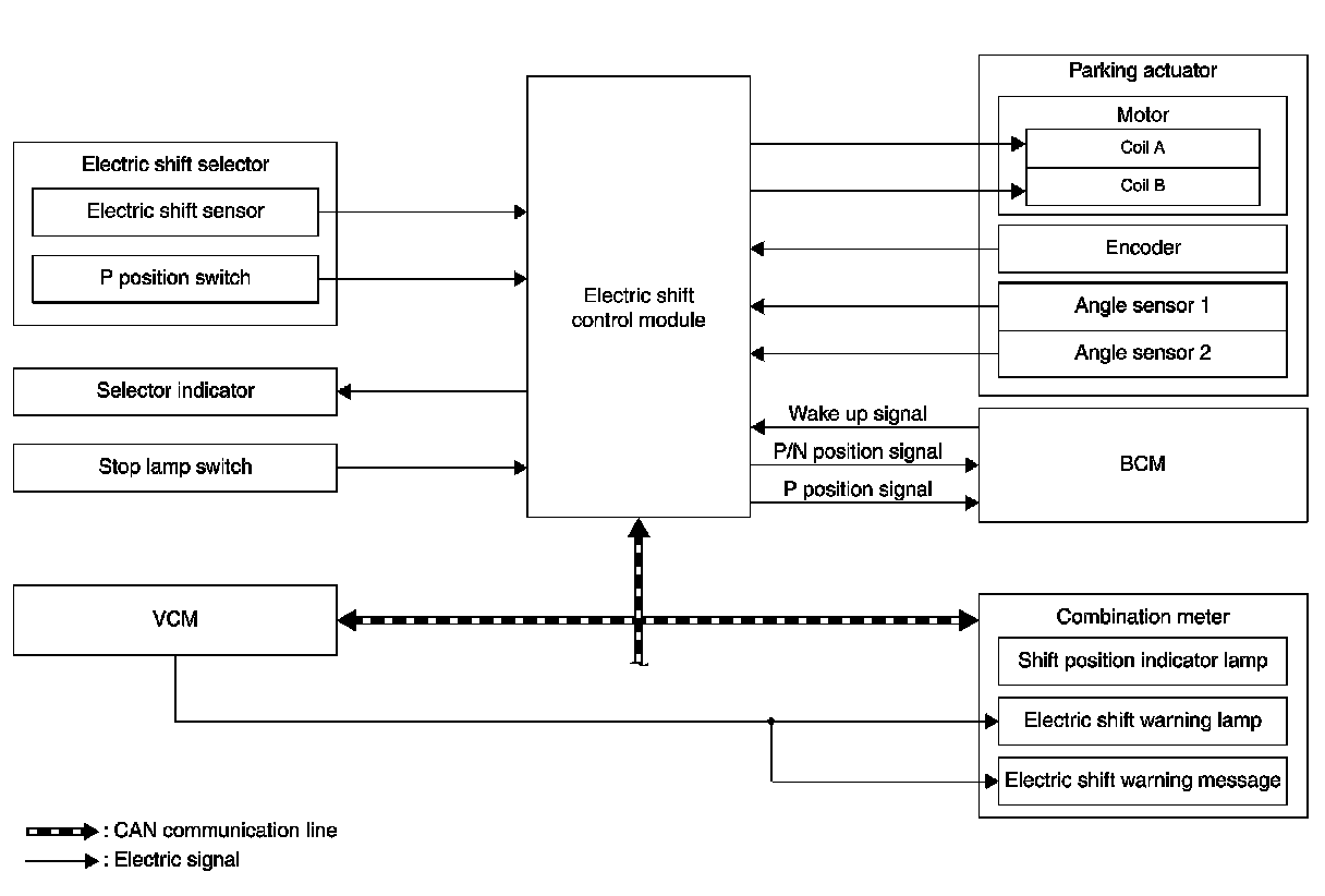 - The electric shift system detects each shift position electrically. In addition, in P position, the electric shift system activates the parking actuator, according to electrical signals received from the P position switch and brings the vehicle into the parking state.