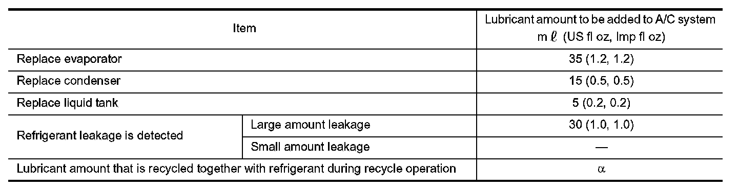 Example: Lubricant amount to be added when replacing evaporator and liquid tank [m (US fl oz, Imp fl oz)] = 35 (1.2, 1.2) + 5 (0.2, 0.2) + Alpha