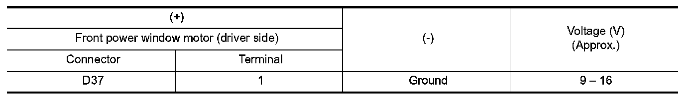 3.Check voltage between front power window motor (driver side) harness connector and ground.