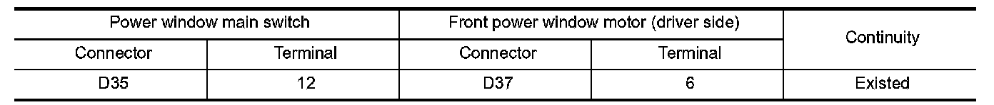 2.Check continuity between power window main switch harness connector and front power window motor (driver side) harness connector.