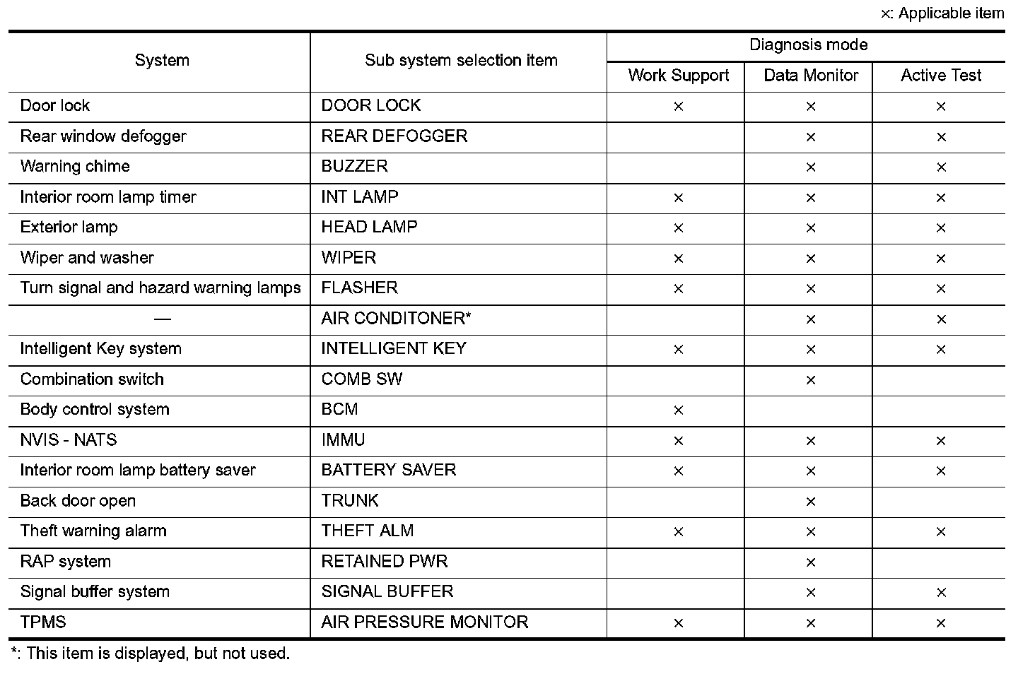 It can perform the diagnosis modes except the following for all sub system selection items.