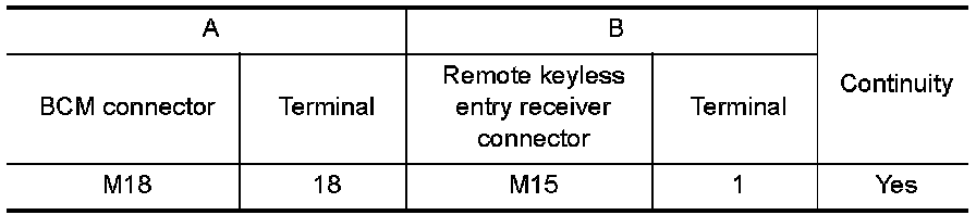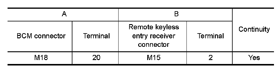 1. Check continuity between BCM connector M18 (A) terminal 20 and remote keyless entry receiver connector M15 (B) terminal 2.