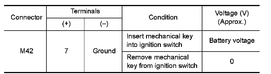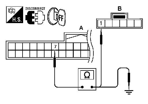 1. Check continuity between Intelligent Key unit harness connector M42 (A) terminal 7 and key switch and ignition knob switch harness connector M49 (B) terminal 1.