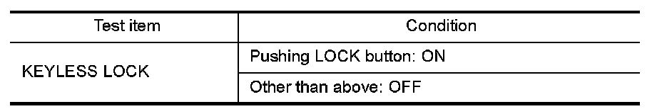 Check keyfob function in "DATA MONITOR" mode with CONSULT-III. When pushing lock button of keyfob, the corresponding monitor item should be turned as follows.