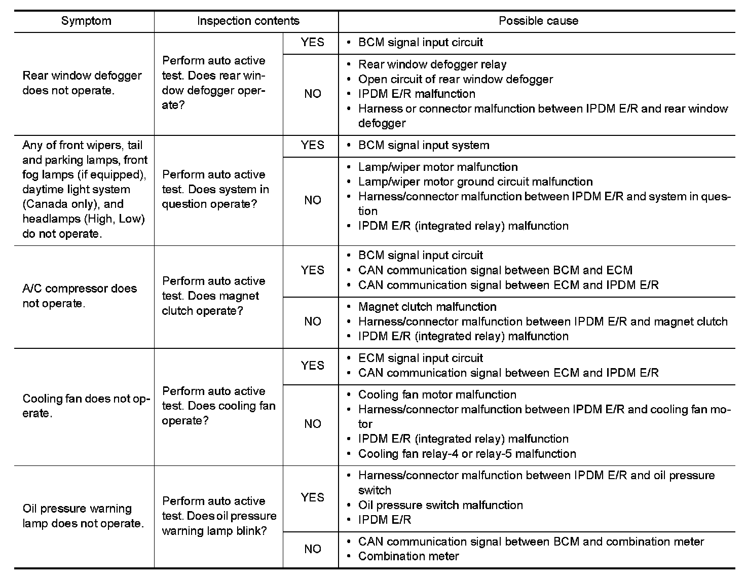 - If any of the systems controlled by IPDM E/R cannot be operated, possible cause can be easily diagnosed using auto active test.