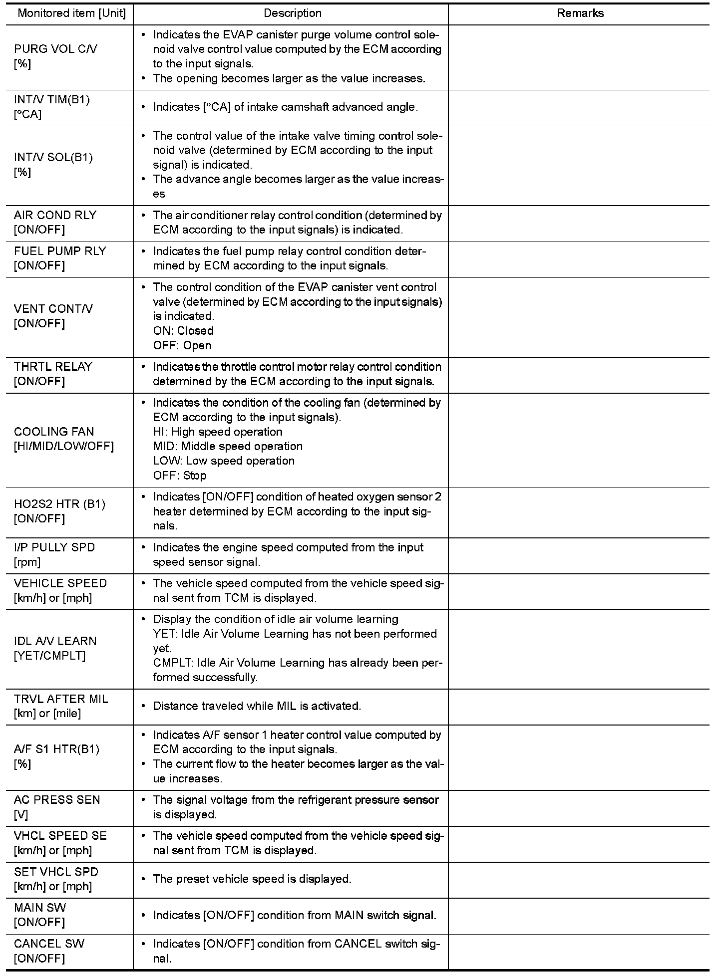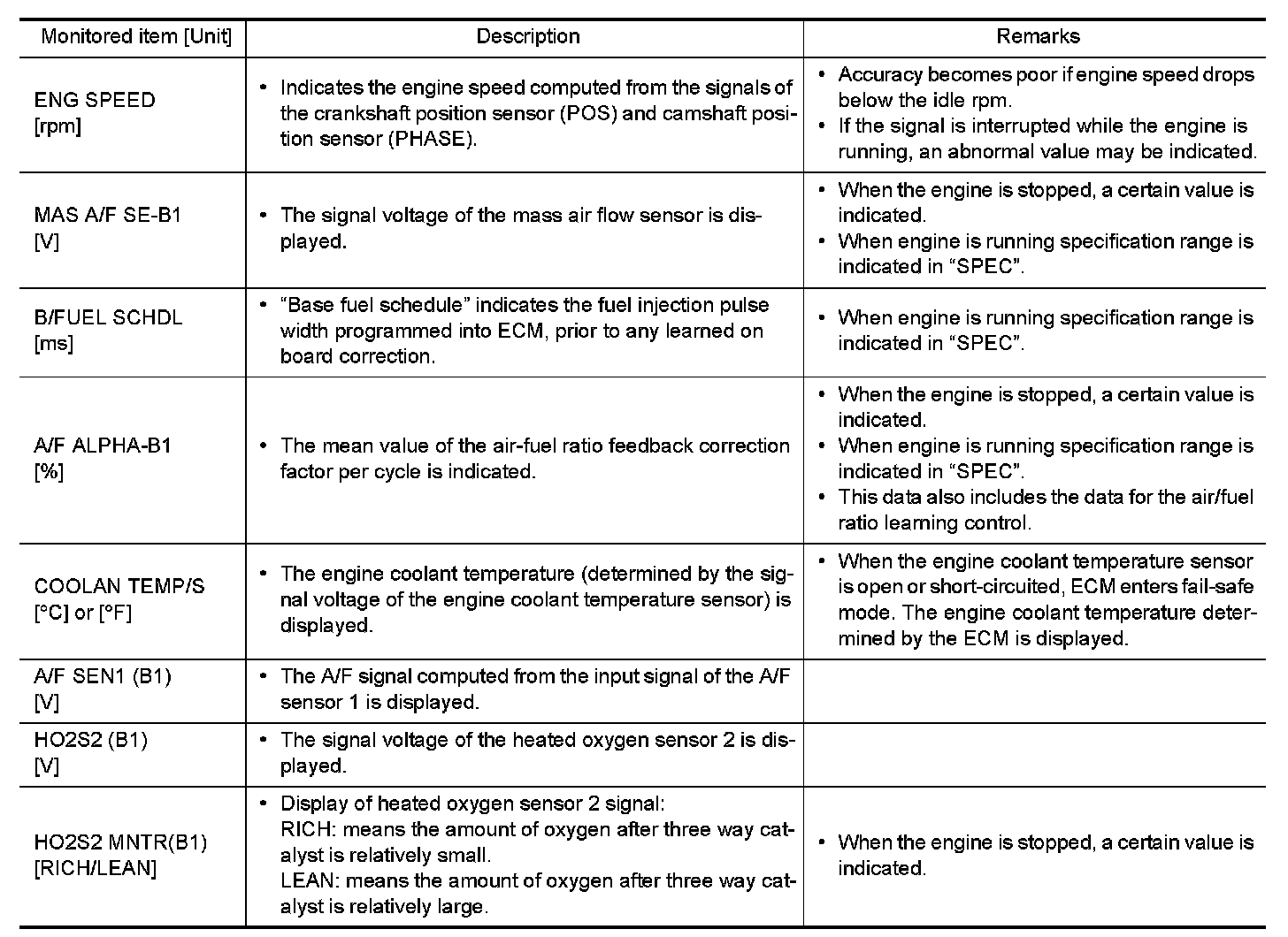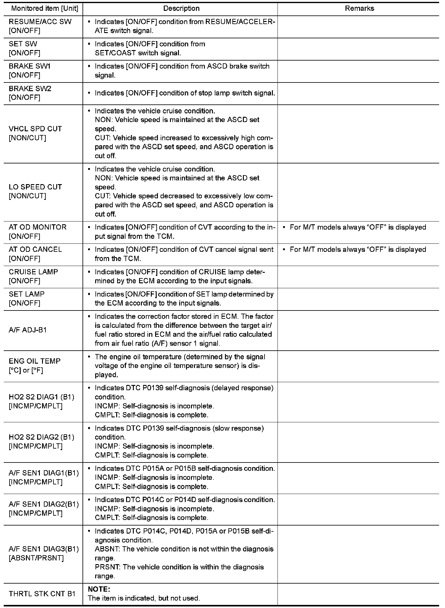 NOTE: Any monitored item that does not match the vehicle being diagnosed is deleted from the display automatically.