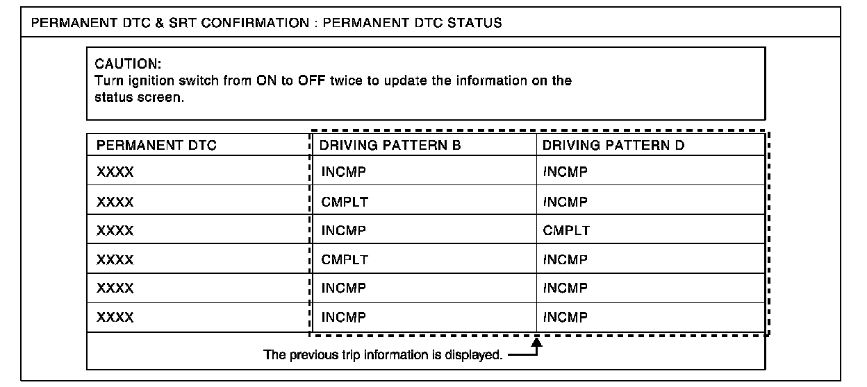Permanent DTCs stored in ECM memory are displayed on the CONSULT-III screen to show if a driving pattern required for erasing permanent DTCs is complete (CMPLT) or incomplete (INCMP).