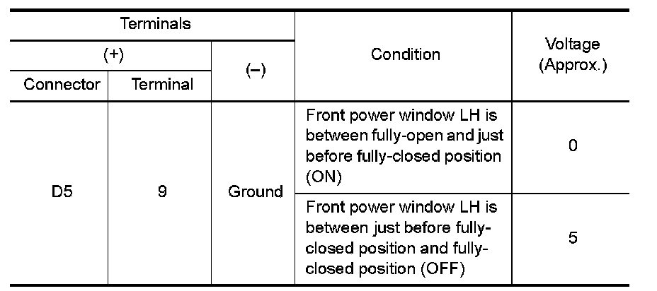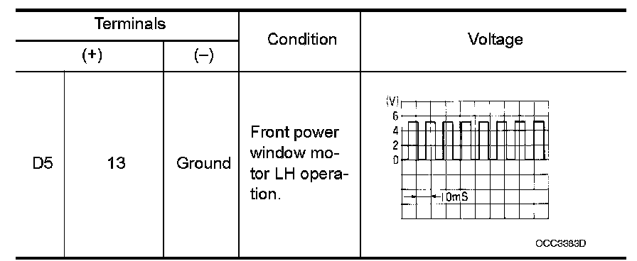 Measure voltage between main power window and door lock/unlock switch connector D5 terminal 13 and ground with oscilloscope when power window is in automatic closing operation.