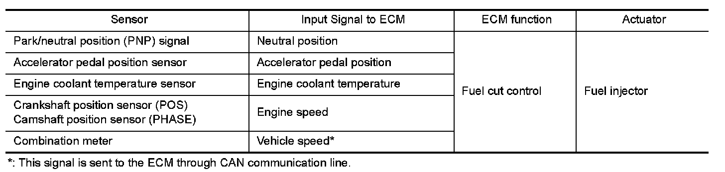 If the engine speed is above 1,800 rpm under no load [for example, the selector lever position is P or N (CVT), Neutral (M/T) and engine speed is over 1,800 rpm] fuel will be cut off after some time. The exact time when the fuel is cut off varies based on engine speed.