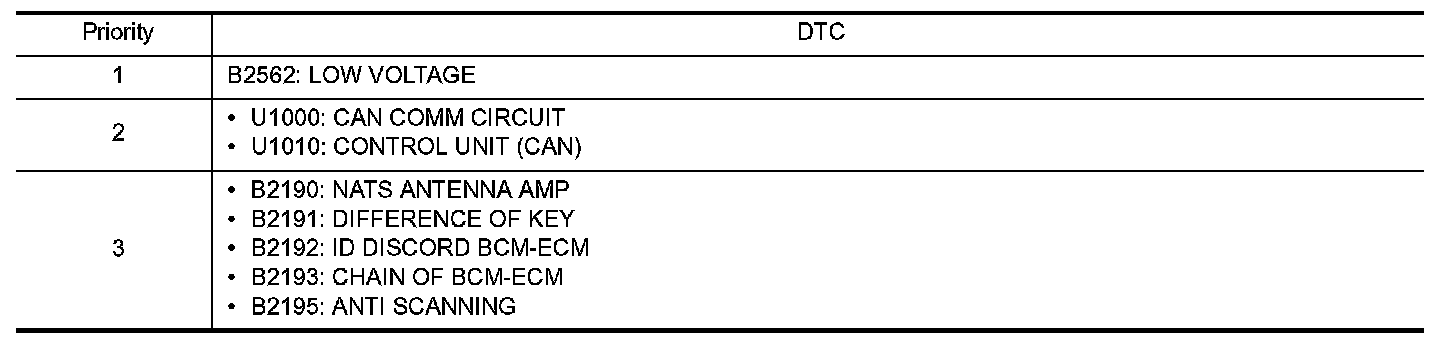 If some DTCs are displayed at the same time, perform inspections one by one based on the following priority chart.