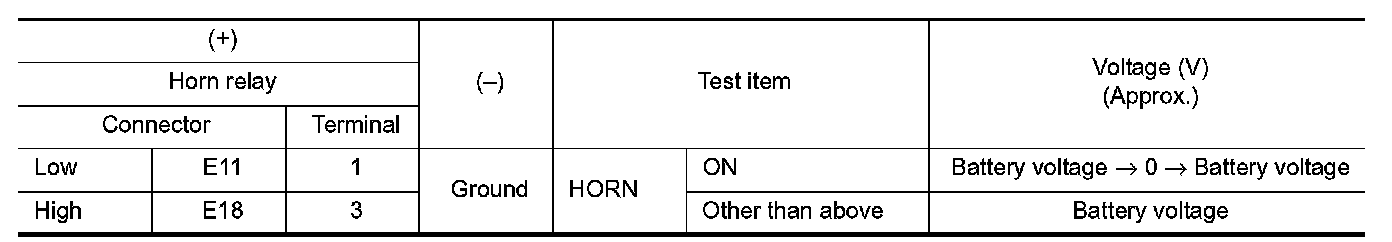 3.Check voltage between malfunctioning horn relay harness connector and ground.