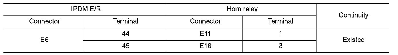 3.Check continuity between IPDM E/R harness connector and malfunctioning horn relay terminal connector.