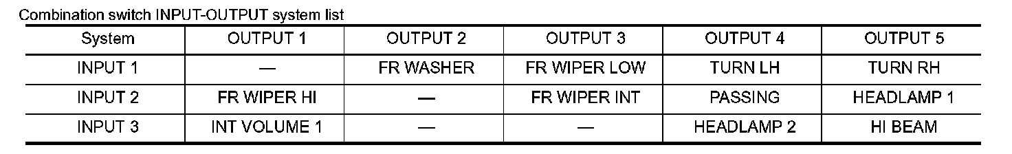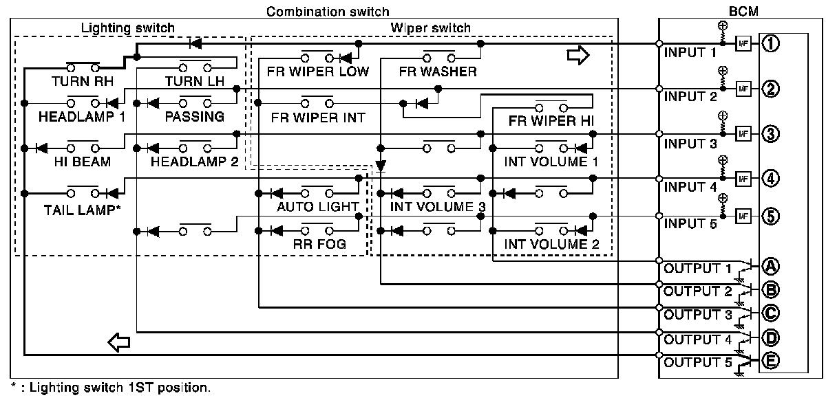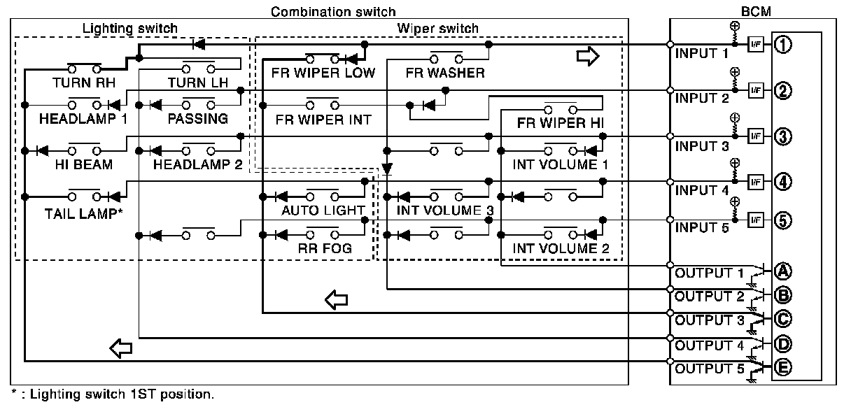 - BCM detects the combination switch status signal "1E" when the signal of OUTPUT 5 is input to INPUT 1.