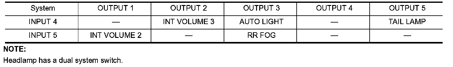 - BCM detects the combination switch status signal "1CE" when the signals of OUTPUT 3 and OUTPUT 5 are input to INPUT 1.
