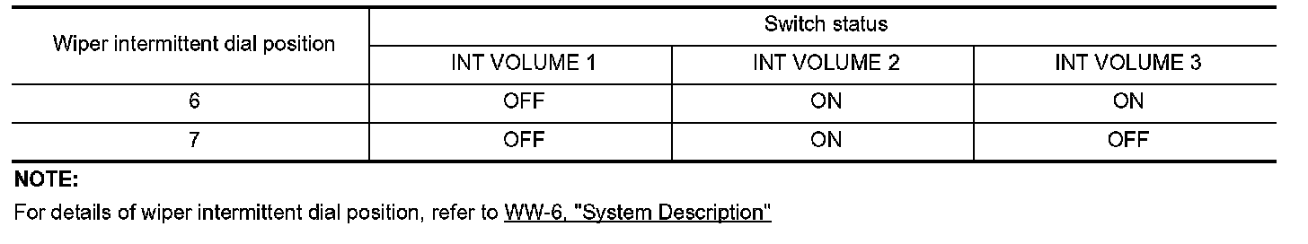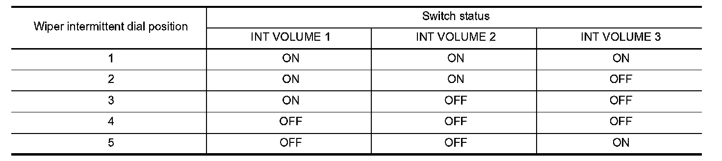 BCM judges the wiper intermittent dial 1 - 7 by the status of INT VOLUME 1, 2 and 3 switches.
