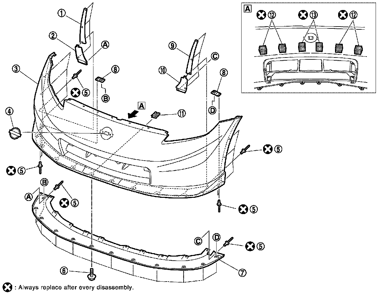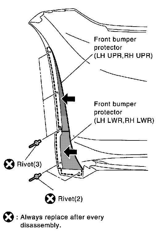 2.Remove the rivets from the left and right of the front bumper fascia and then remove the front bumper protector (RH, UPR) and the front bumper protector (LH, UPR) and the front bumper protector (RH, LWR) and the front bumper protector (LH, LWR).
