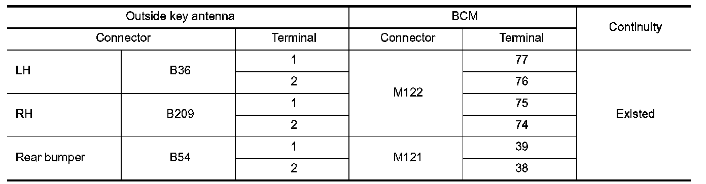 2.Check continuity between malfunctioning outside key antenna harness connector and BCM harness connector.