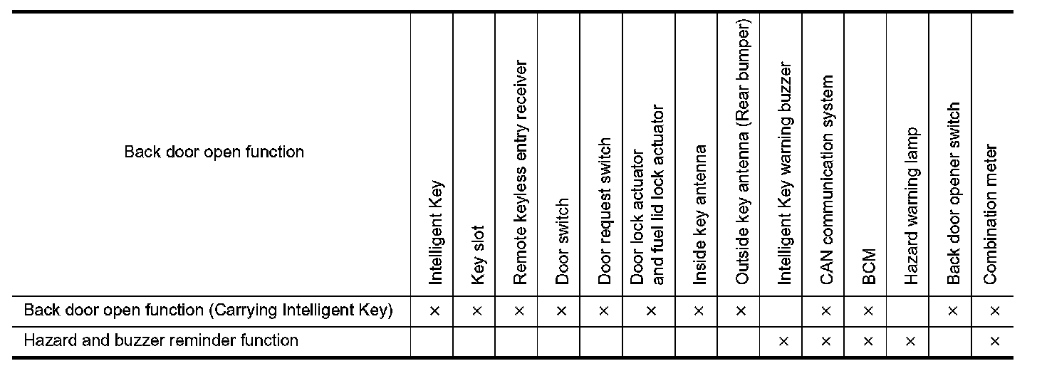 - BCM opens back door, and at the same time blinks hazard warning lamp and sounds Intelligent Key warning buzzer.