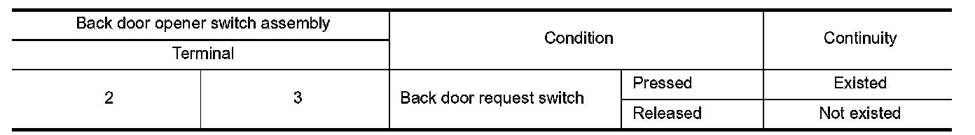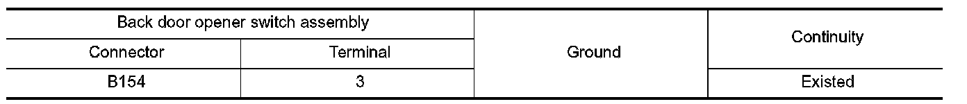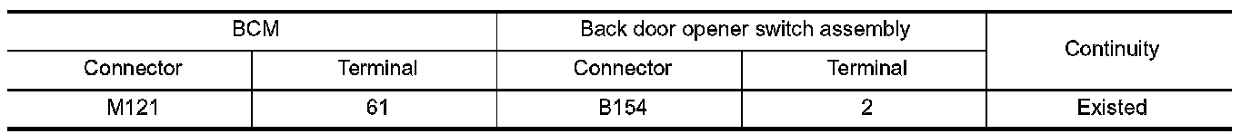 2.Check continuity between BCM harness connector and back door opener switch assembly harness connector.