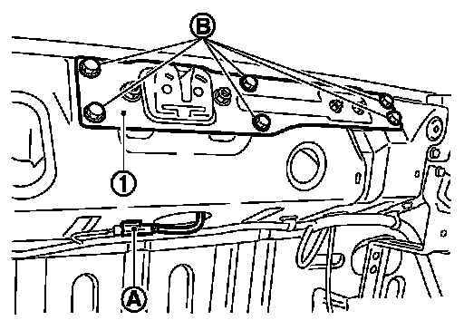 4.Remove mounting bolts (B) of back door lock and actuator bracket (1).