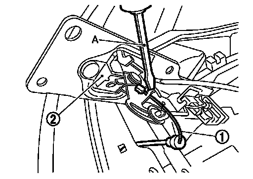 6.Using a flat-bladed screwdriver (A) disconnect inside handle cable (1) from back door lock (2).