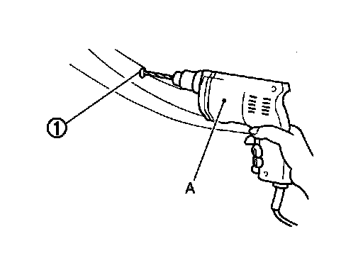 Grind the head of rivet (1) with a drill (A) [bit of 4.0 - dia. 4.5 mm (0.157 - dia. 0.177 in)] and then remove the hood lock stay (LH/
