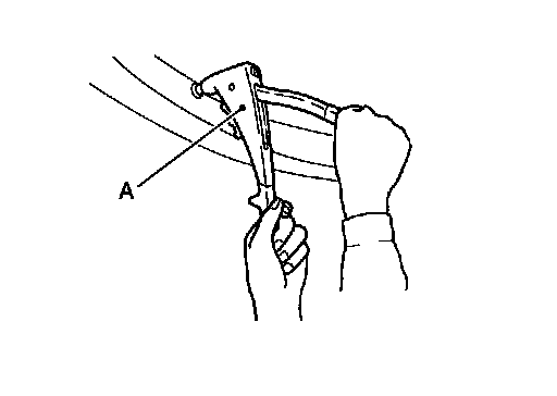 Securely crimp the hood lock stay (LH/RH) with the radiator core support assembly with a hand riveter (A).